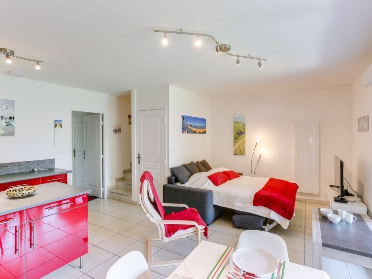 3-room terraced house 59 m2. Comfortable and beautiful furnishings: living/dining room with 1 sofabed (140 cm), TV (flat screen). Exit to the terrace. Open kitchen (oven, dishwasher, 4 ceramic glass hob hotplates, toaster, kettle, microwave, freezer, electric coffee machine). Sep.