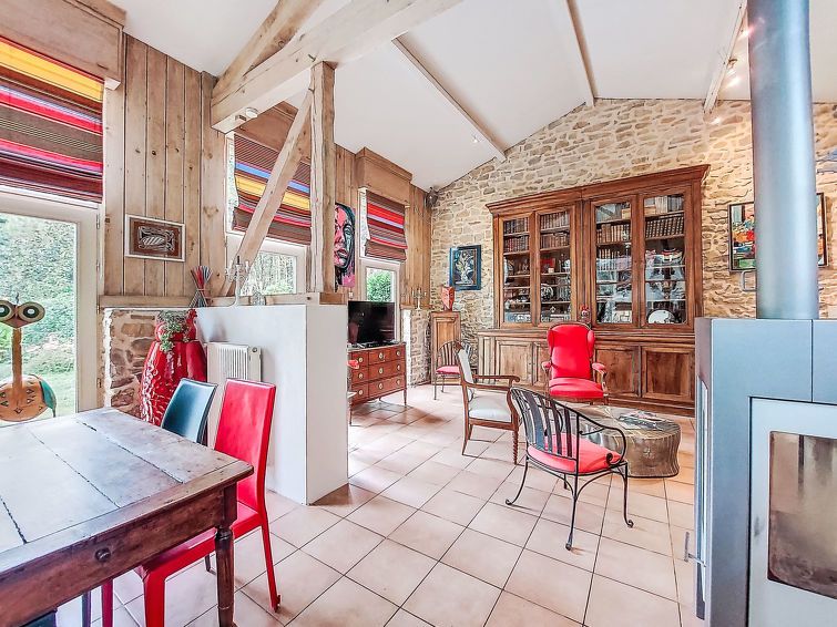 "Le Préau", 5-room house 140 m2 on 2 levels. Bright, beautiful and cosy furnishings: living/dining room with dining table and TV (flat screen), wood-burning stove and air conditioning. Exit to the terrace. 1 room with 1 french bed (160 cm, length 200 cm). 1 room with 1 french bed (140 cm, length 190 cm).