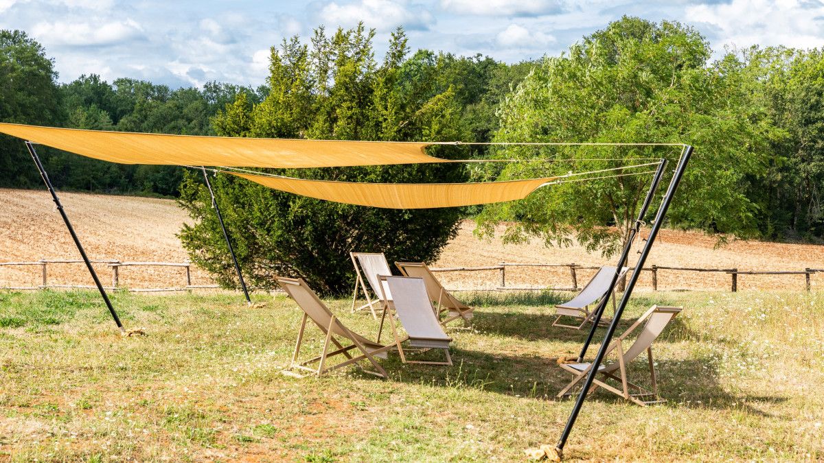 bordée de voiles d’ombrage, une table avec la vue sur la nature sous une
