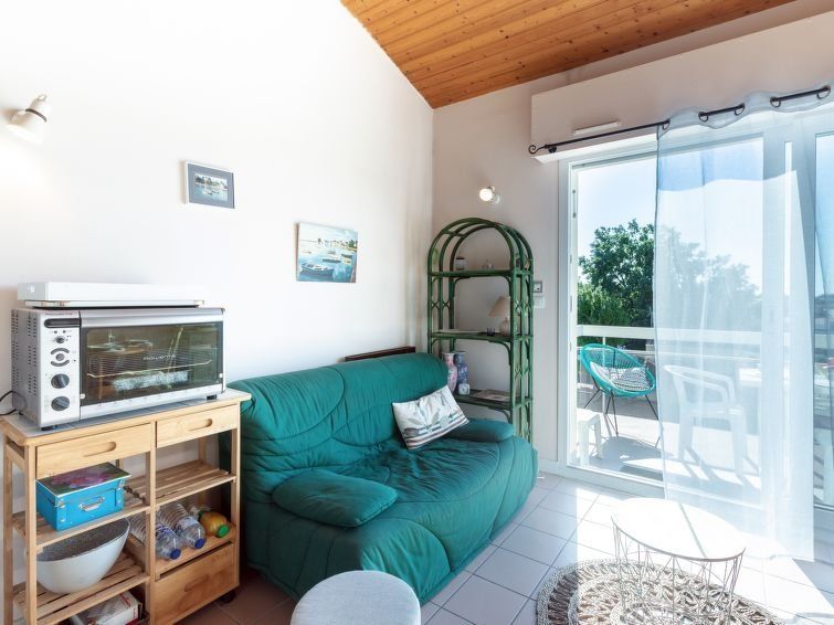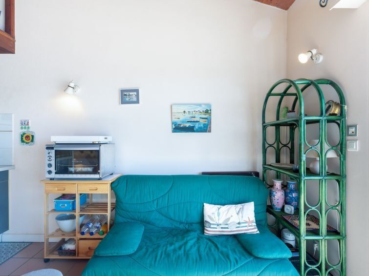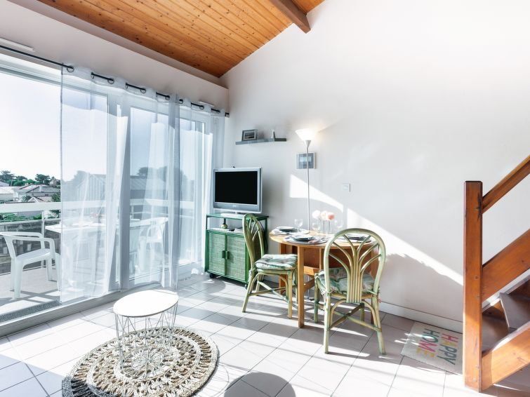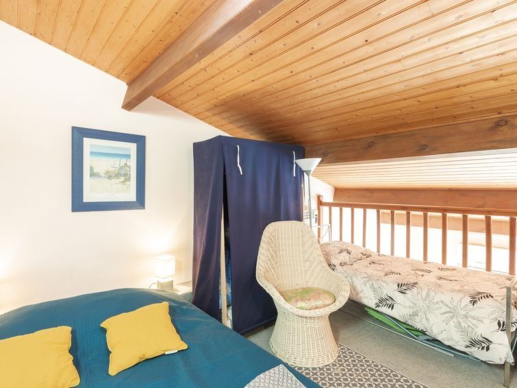 1-room maisonette 26 m2 on 2nd floor. Living room with TV (flat screen). Exit to the balcony. Kitchenette (4 hot plates, mini-oven, toaster, microwave, electric coffee machine). Bath/WC. Electric heating. Upper floor: (steep stair) gallery with sloping ceilings with rooflight with 1 bed (90 cm, length 190 cm), 1 french bed (1 x 140 cm, length 190 cm).