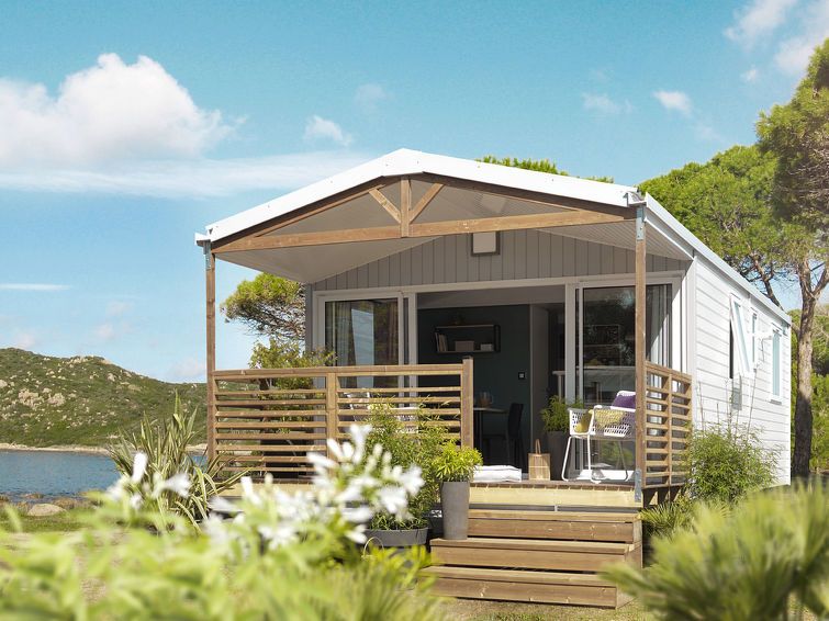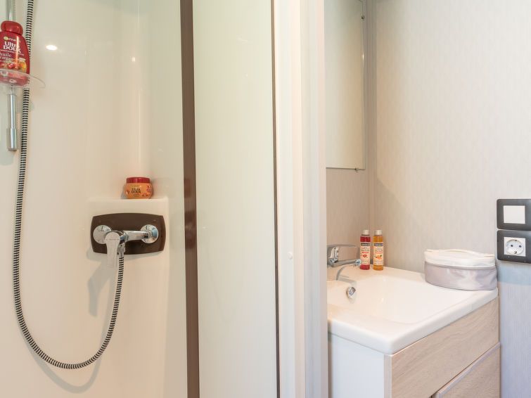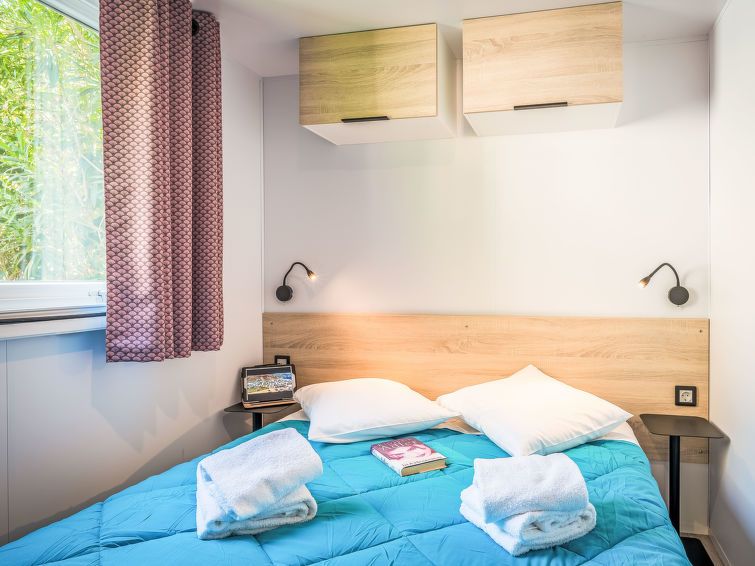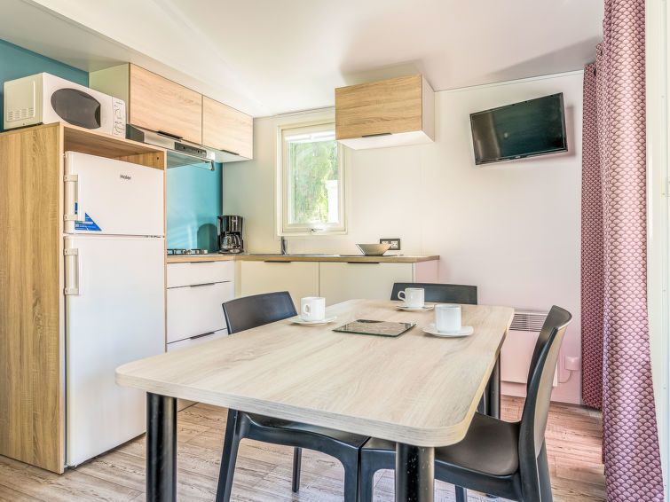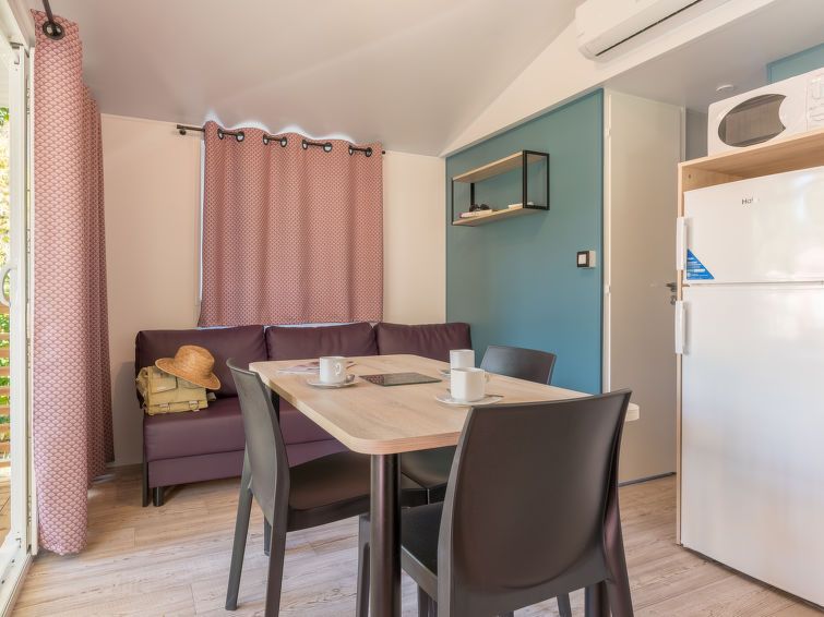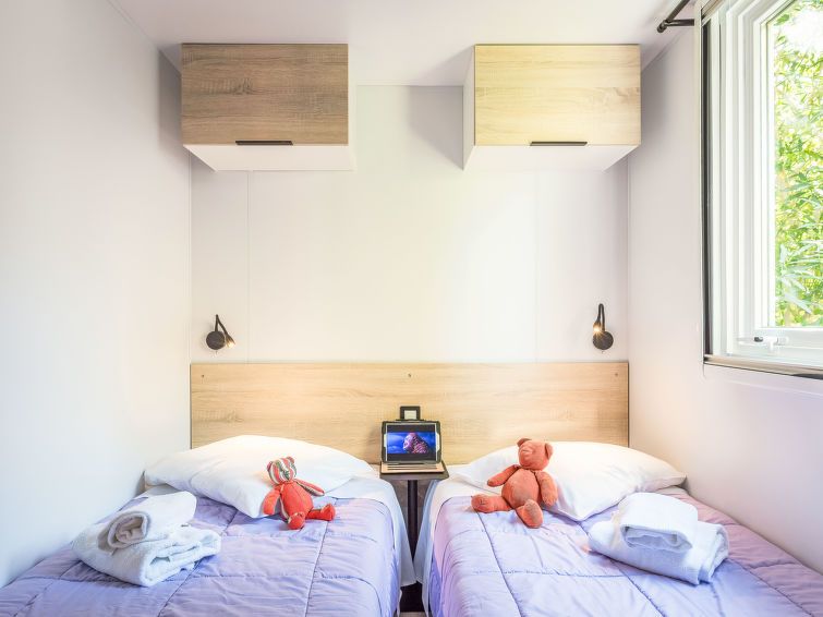 "Le Mediterranée", 3-room mobile home 28 m2. Practical furnishings: living/dining room with dining table, satellite TV and international TV channels. Exit to the terrace. 1 room with 1 french bed (140 cm, length 190 cm). 1 room with 2 beds (80 cm). Open kitchen (4 gas rings, toaster, kettle, microwave, freezer, electric coffee machine).