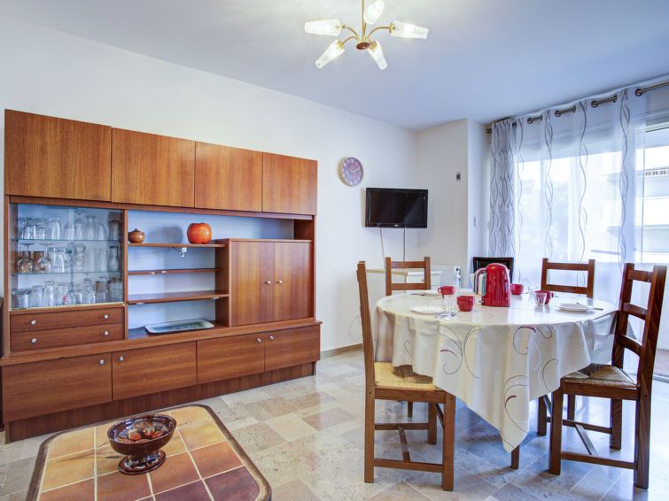"Le Racou", 2-room apartment 56 m2 on 1st floor. Very beautiful furnishings: living/dining room with panoramic window with TV (flat screen), air conditioning and fan. Exit to the terrace. 1 room with 1 french bed (1 x 140 cm, length 190 cm). Open sleeping alcove with 2 beds (90 cm, length 190 cm).