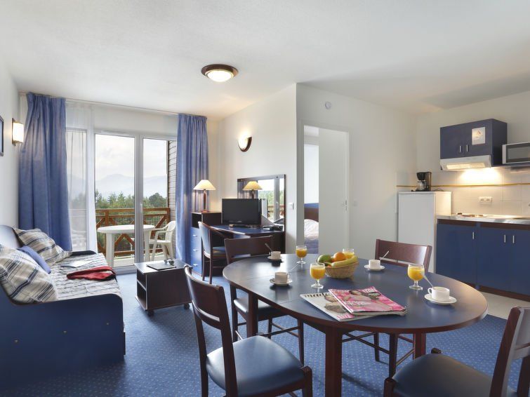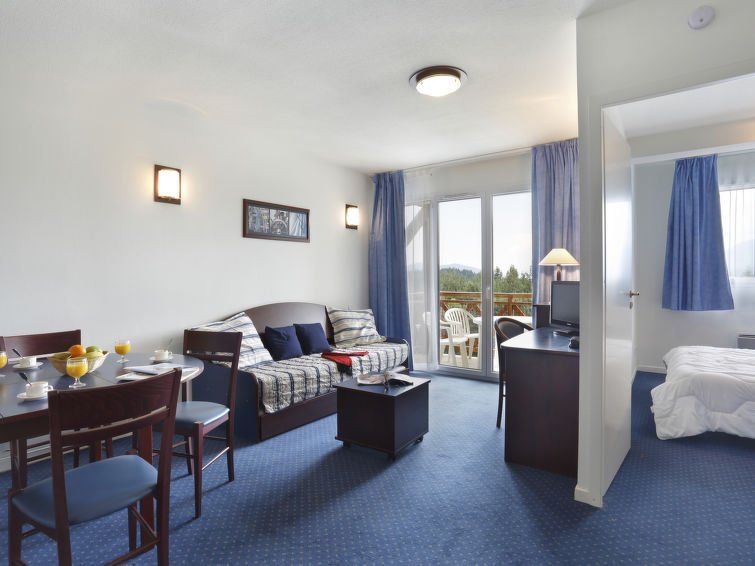 "Pyrénées 2000/ 2 pièces cabine 6 pers.", 2-room apartment 40 m2. Practical furnishings: living/sleeping room with 1 pull-out bed (2 x 90 cm), dining table and TV (flat screen). 1 room with 1 french bed. Alcove with 1 x 2 bunk beds. Kitchenette (2 hot plates, dishwasher, microwave, electric coffee machine).