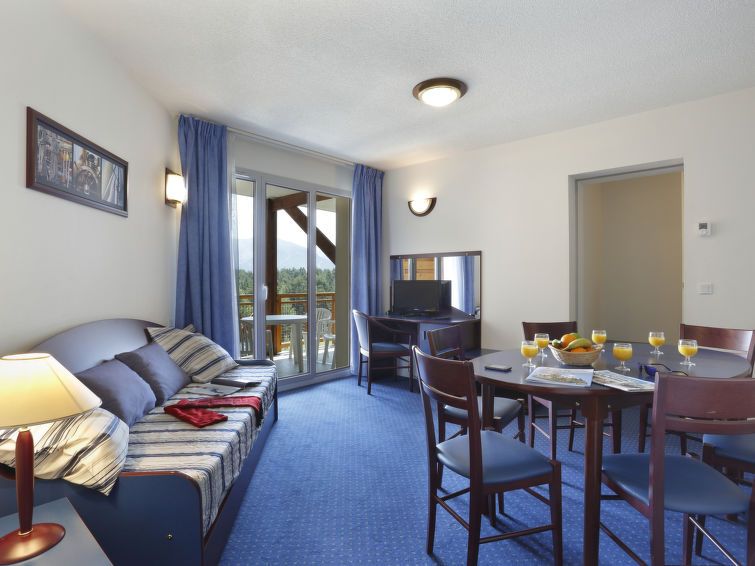 "Pyrénées 2000/ 4 pièces 8 pers. VUE", 4-room apartment 50 m2. Practical furnishings: living/sleeping room with 1 pull-out bed (2 x 90 cm), dining table and TV (flat screen). 2 rooms, each room with 1 french bed. 1 room with 1 french bed and shower/WC. Kitchenette (4 hot plates, dishwasher, microwave, electric coffee machine).