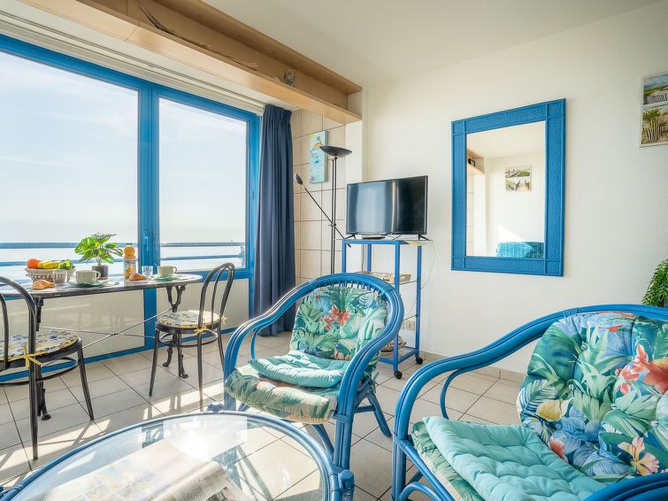 1-room apartment 27 m2 on 4th floor. Living/sleeping room with 1 double sofabed (1 x 140 cm, length 200 cm), TV and flat screen. Kitchenette (oven, 2 ceramic glass hob hotplates, microwave, electric coffee machine). Shower, sep. WC. Heating, electric heating. Beautiful view of the sea.