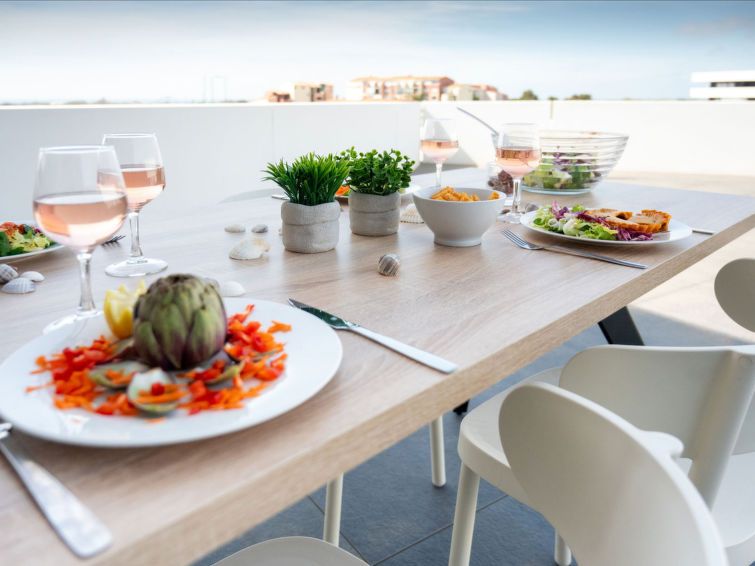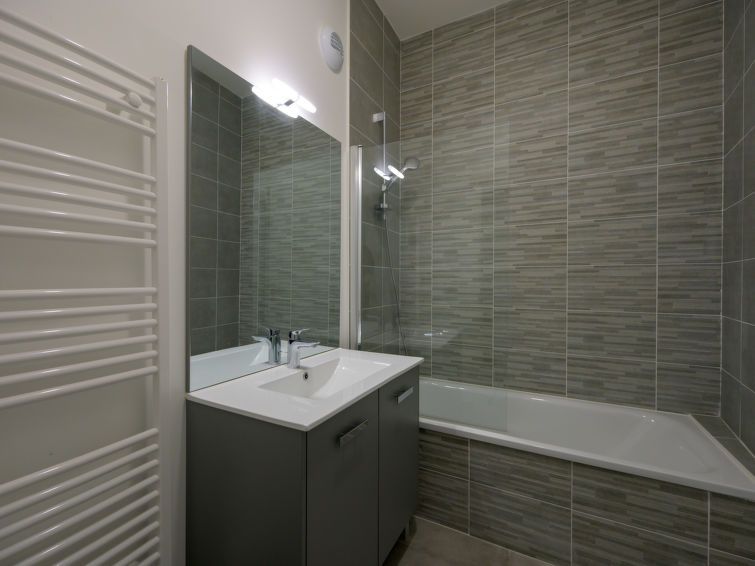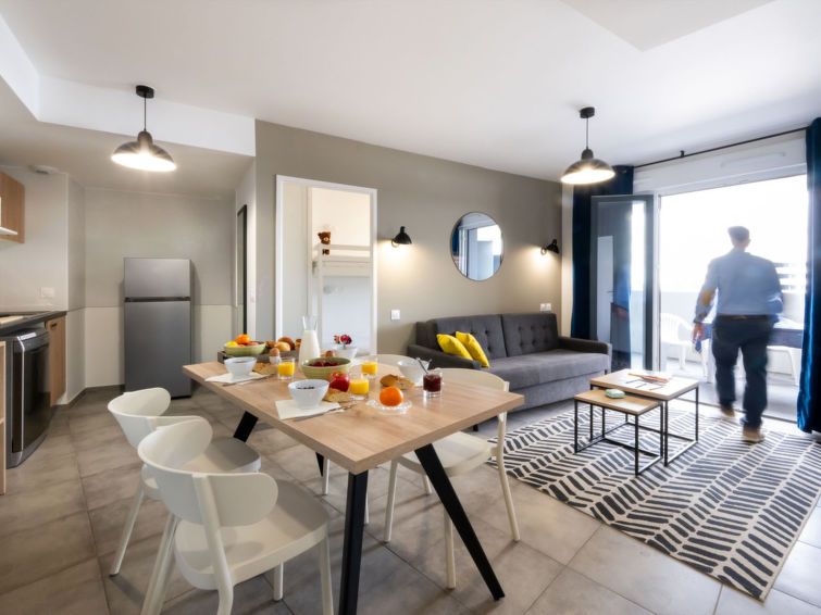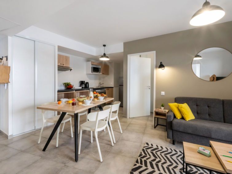 "Le Sylène T2/6", 2-room apartment 38 m2. Comfortable and modern furnishings: living/sleeping room with 1 double sofabed (140 cm, length 190 cm), dining table and TV can be hired (flat screen). Exit to the balcony, to the terrace. 1 room with 1 french bed (140 cm, length 190 cm).