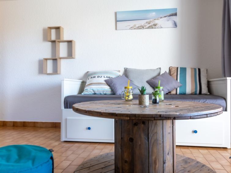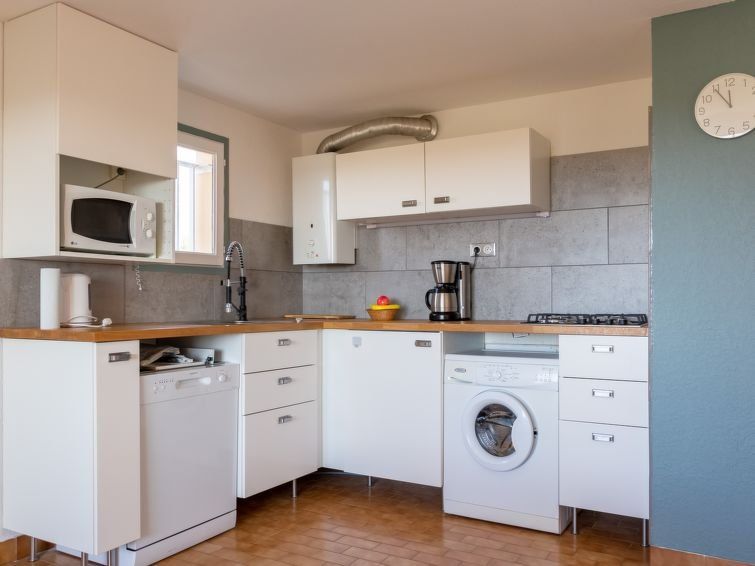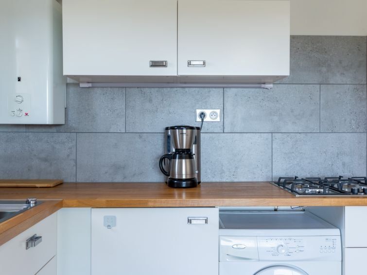 3-room apartment 42 m2 on 1st floor, south facing position. Living/dining room with 1 double sofabed (160 cm, length 200 cm), TV. Exit to the terrace. 1 room with 1 french bed (140 cm, length 200 cm). 1 room with 1 x 2 bunk beds (90 cm, length 190 cm). Open kitchen (4 hot plates, dishwasher, kettle, microwave, electric coffee machine).