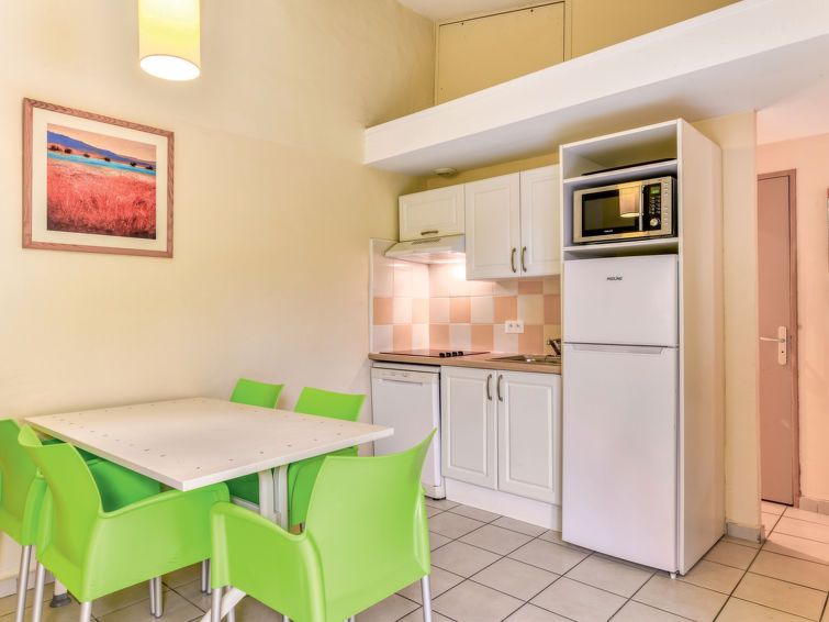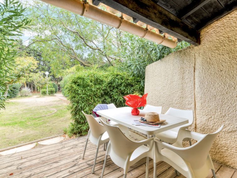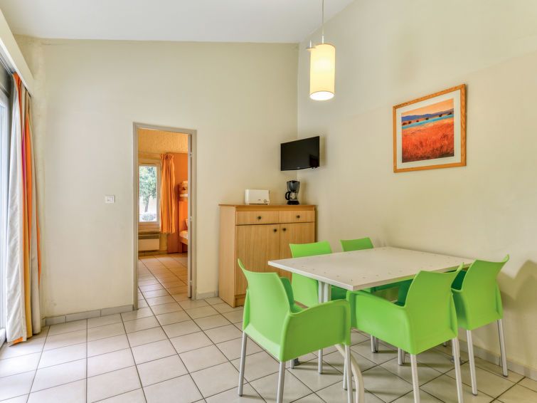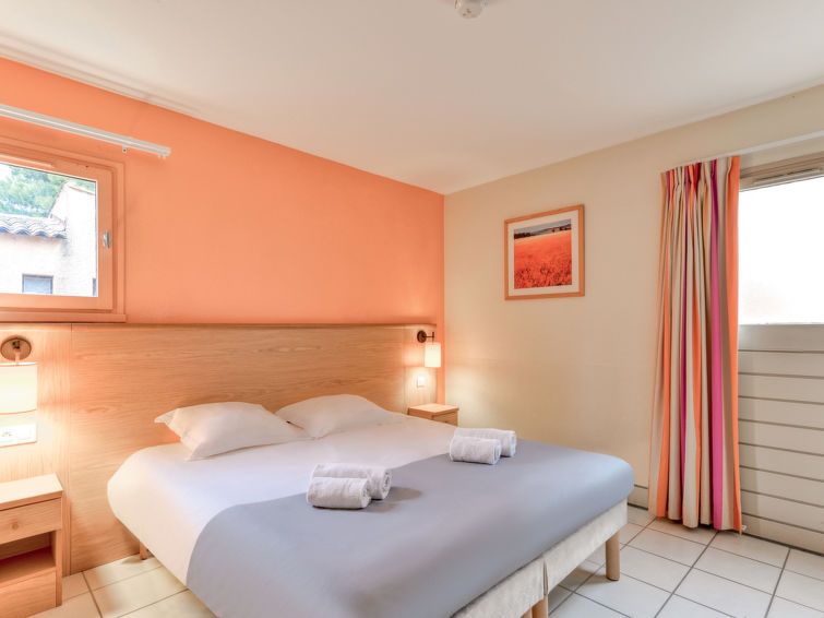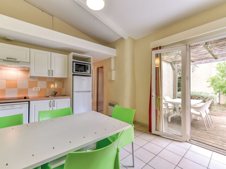 "Sowell Résidence Les Lauriers Roses", 3-room terraced house 25 to 30 m2, on the ground floor. Practical furnishings: living/dining room with satellite TV (flat screen), fan. Exit to the terrace. 1 room with 1 french bed (140 cm, length 190 cm). 1 room with 1 bed (80 cm, length 190 cm), 1 x 2 bunk beds (80 cm, length 190 cm).