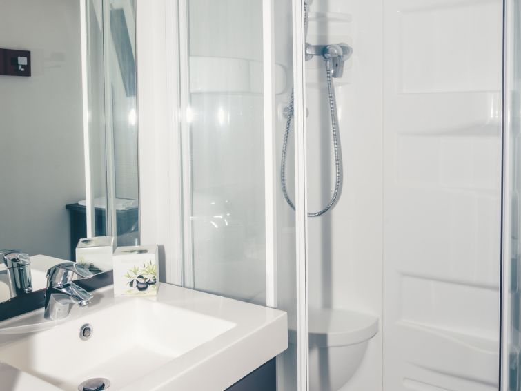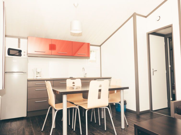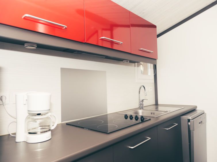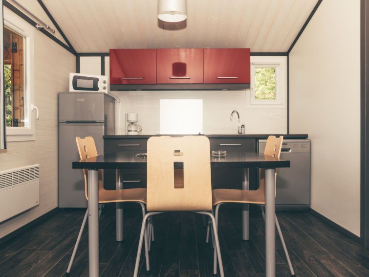 "Les Hameaux de Pomette-Chalet 2 Pers.", 2-room chalet 25 m2. Practical furnishings: living/dining room with dining table and TV (flat screen). Exit to the terrace. 1 room with 1 french bed (140 cm, length 190 cm). Open kitchen (dishwasher, 3 ceramic glass hob hotplates, microwave, freezer, electric coffee machine).