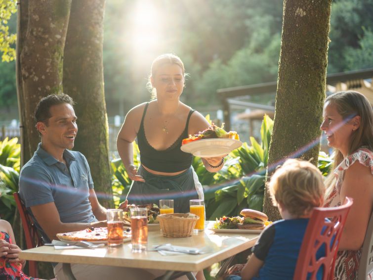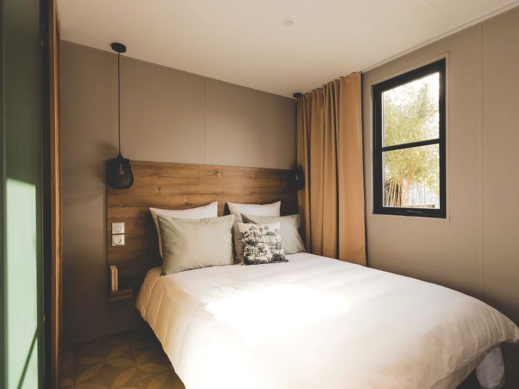 "Lodge Luxe 2 chambres", 3-room chalet 32 m2. Practical furnishings: living/dining room with dining table and TV (flat screen), air conditioning. Exit to the terrace. 1 room with 1 french bed (1 x 160 cm, length 200 cm), TV (flat screen). 1 room with 2 beds (80 cm, length 190 cm).