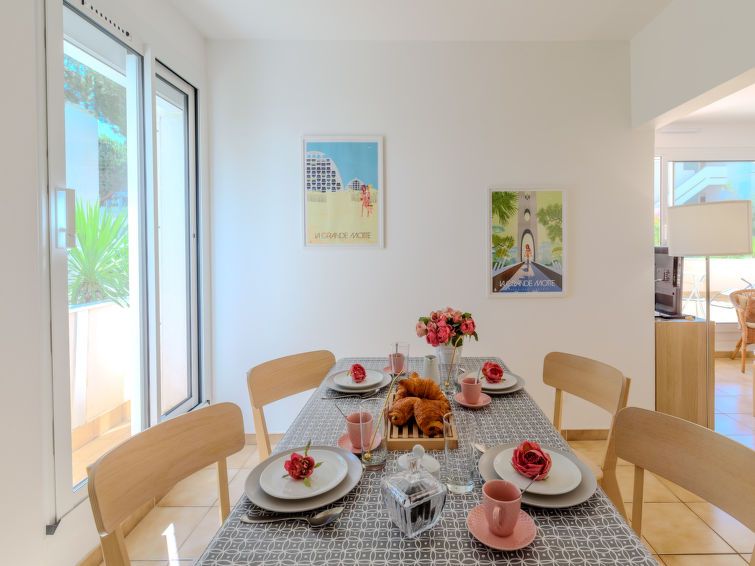 3-room apartment 50 m2 on 1st floor. Living/dining room with TV (flat screen), air conditioning, fan, forced-air heating and electric shutters. 1 room with 1 french bed (140 cm, length 200 cm). Exit to the terrace. 1 room with 1 pull-out bed (2 pers. 2 x 80 cm, length 200 cm). Exit to the terrace.
