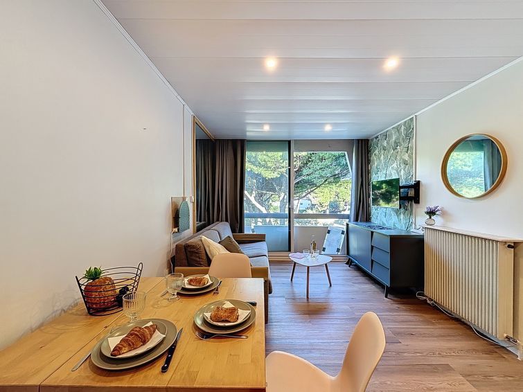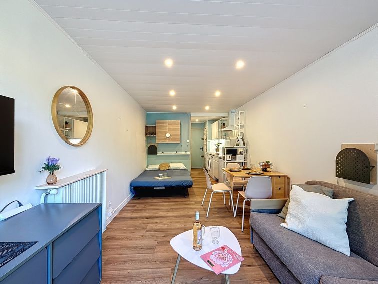 1-room studio 25 m2 on 3rd floor, north-east facing position. Renovated in 2024, practical and modern furnishings: living/dining room, north facing position and east facing position with 1 sofabed (90 cm, length 190 cm), 1 double sofabed (1 x 140 cm, length 190 cm), TV (flat screen), electric heating and fan.