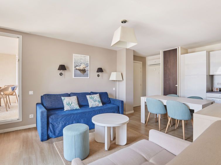"Odalys Référence Les Dunes du Soleil", 2-room apartment 30 m2 on 3rd floor. Comfortable furnishings: living/sleeping room with 1 sofabed and 1 pull-out bed (1 pers.), dining table, TV and air conditioning. Exit to the balcony. 1 small room with 1 x 2 bunk beds. Small, open kitchen (dishwasher, 4 ceramic glass hob hotplates, kettle, microwave, electric coffee machine).