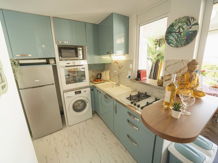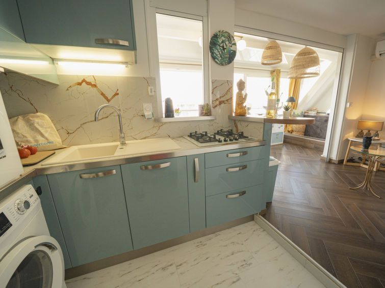 2-room apartment 45 m2 on 7th floor. Beautiful furnishings: living/dining room with TV (flat screen). 1 room, south facing position, window onto the living room with 1 french bed (1 x 140 cm, length 190 cm). Interconnecting room with 1 double sofabed (120 cm, length 190 cm). Kitchenette (oven, dishwasher, 4 gas rings, toaster, kettle, microwave, freezer, electric coffee machine, Capsules for coffee machine (NESPRESSO) extra).