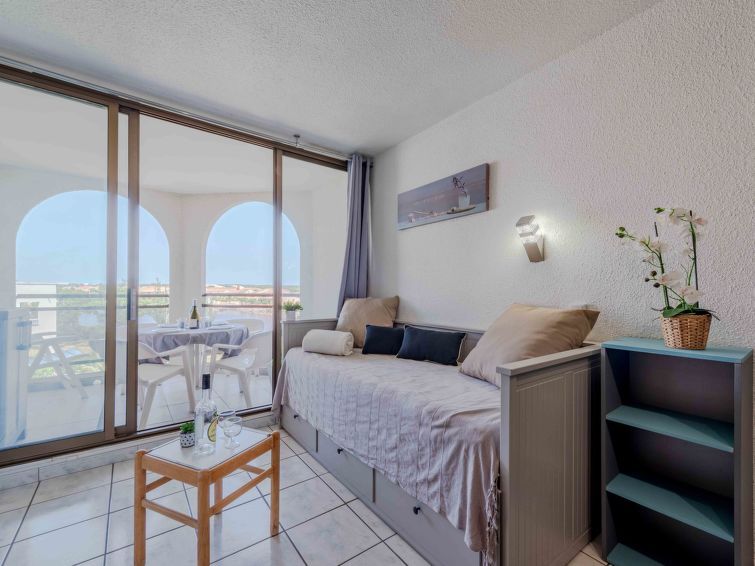 1-room apartment 20 m2 on 2nd floor, north-east facing position. Living/dining room with 1 pull-out bed (2 pers. 2 x 80 cm, length 200 cm), TV (flat screen). Exit to the terrace. Sleeping alcove with 1 x 2 bunk beds (90 cm, length 190 cm), TV (flat screen). (2 hot plates, oven, microwave, freezer, electric coffee machine).