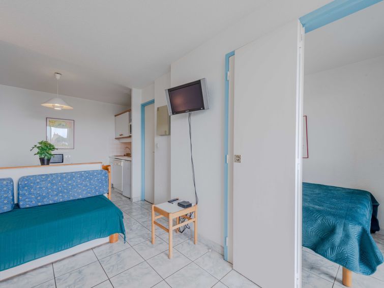 2-room apartment 23 m2, south-east facing position. Living/dining room with 1 sofabed (70 cm, length 190 cm), 1 pull-out bed (2 pers. 2 x 70 cm, length 190 cm), TV (flat screen). Exit to the terrace. 1 room with 1 french bed (1 x 140 cm, length 190 cm). Kitchenette (4 hot plates, mini-oven, dishwasher, microwave, electric coffee machine).