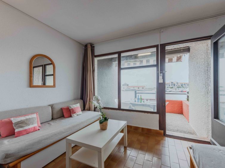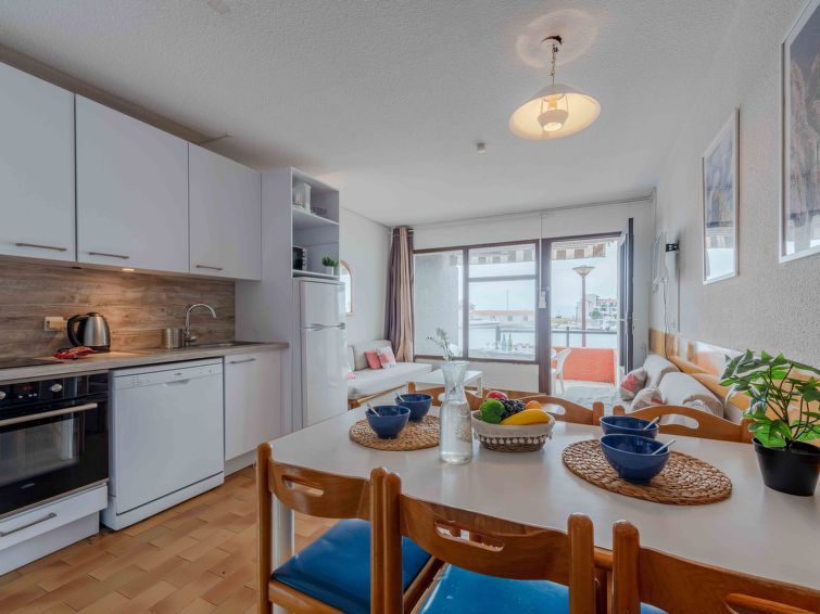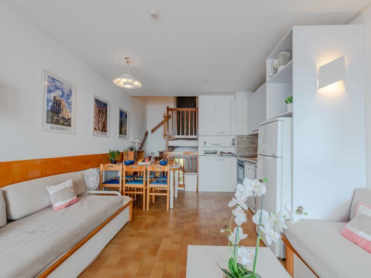 3-room apartment 45 m2, on the ground floor, south-west facing position. Dining room with 1 sofabed (80 cm, length 180 cm), 1 pull-out bed (2 pers. 2 x 80 cm, length 180 cm), TV (flat screen). Exit to the terrace. Open kitchen (2 hot plates, oven, dishwasher, kettle, microwave, freezer, electric coffee machine).