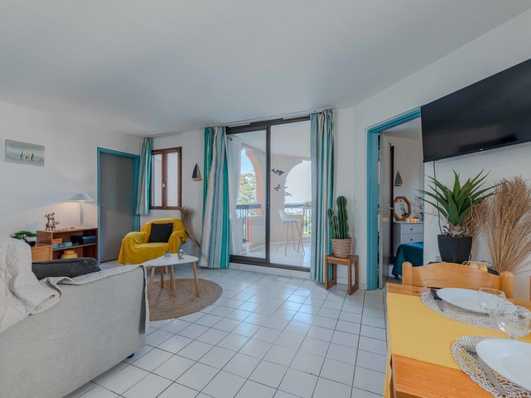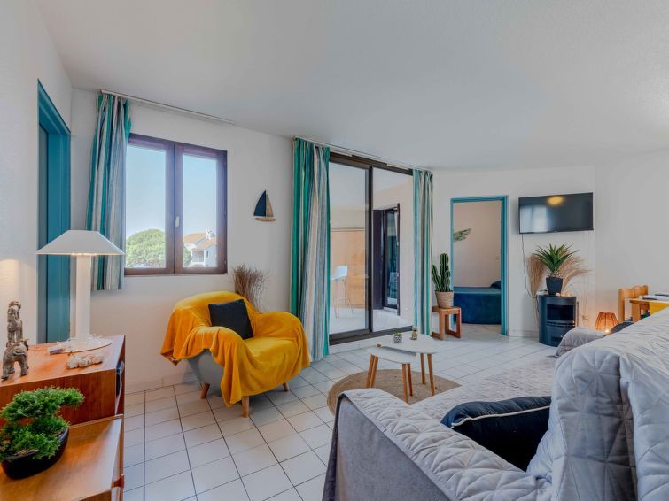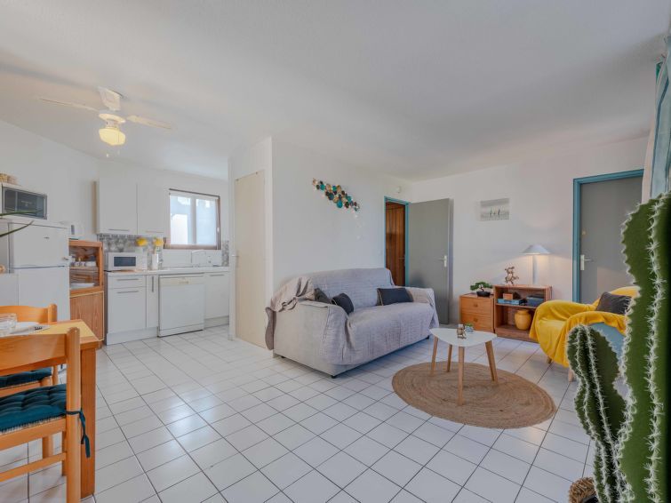 2-room apartment 34 m2 on 1st floor, south-west facing position. Living/dining room with TV (flat screen). Exit to the terrace. 1 room with 1 french bed (1 x 140 cm, length 190 cm). Exit to the terrace. Open kitchen (mini-oven, dishwasher, 4 ceramic glass hob hotplates, toaster, kettle, microwave, freezer, electric coffee machine).