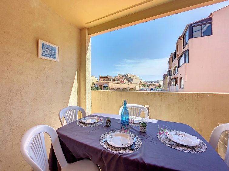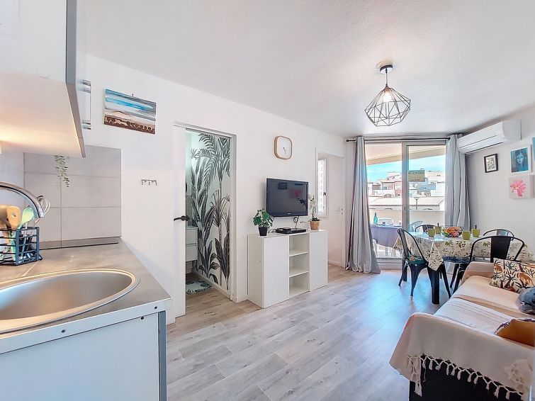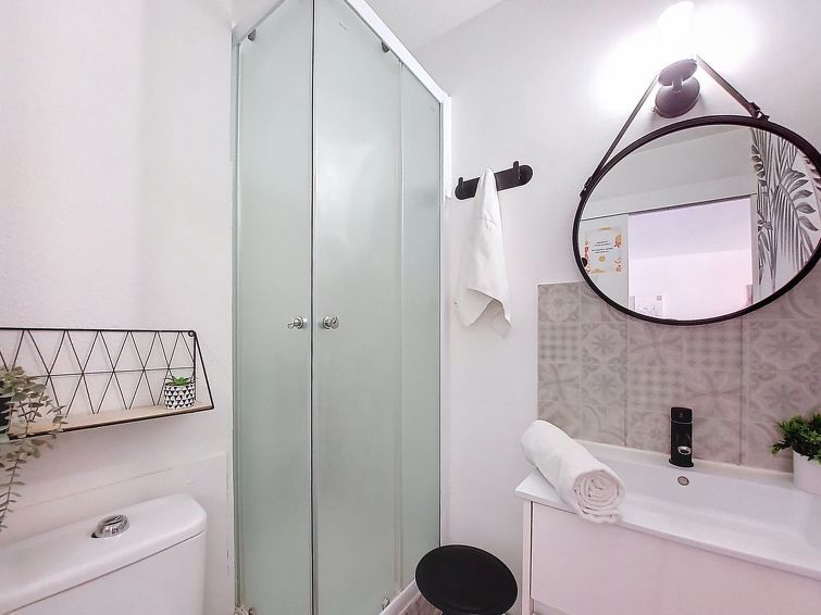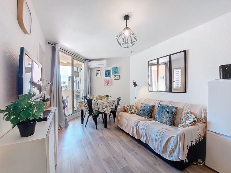 2-room apartment 27 m2 on 1st floor. Dining room with 1 sofabed (140 cm, length 190 cm), TV (flat screen). Exit to the terrace. 1 room with 1 french bed (1 x 140 cm, length 190 cm). Kitchenette (mini-oven, 2 ceramic glass hob hotplates, toaster, kettle, microwave, electric coffee machine).