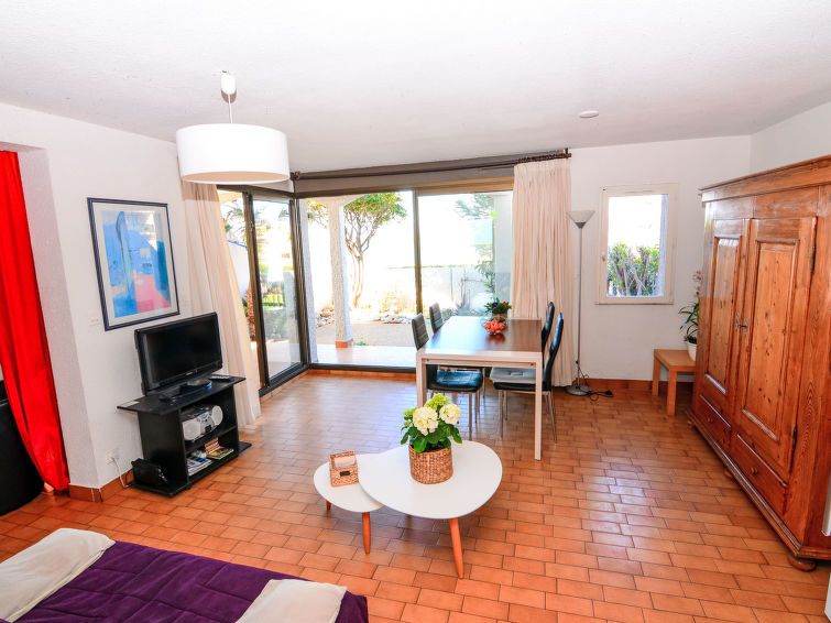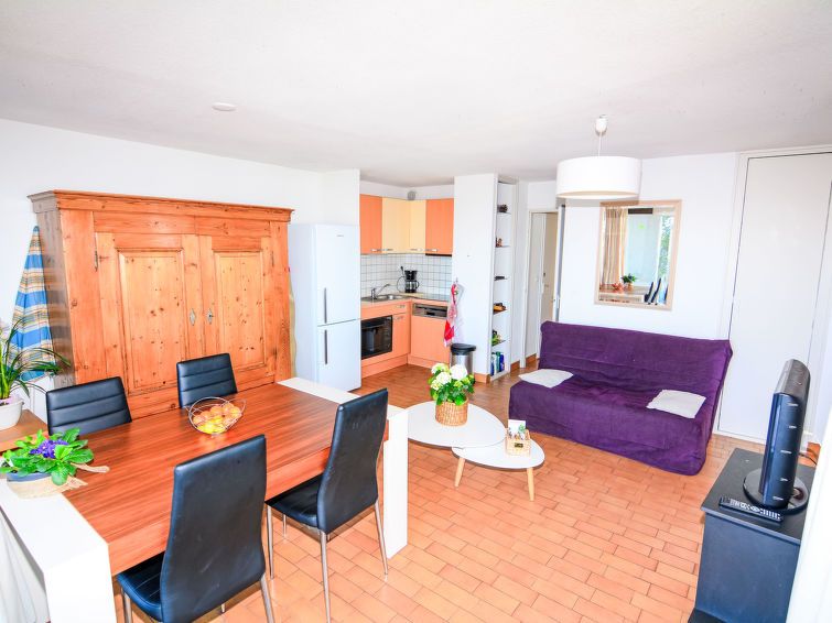 4-room apartment 50 m2, on the ground floor, south-west facing position. Living/dining room with TV (flat screen). Exit to the terrace. 1 room with 1 french bed (1 x 160 cm, length 200 cm). Sleeping alcove with 1 double sofabed (1 x 140 cm, length 190 cm). 1 room with 1 x 2 bunk beds (80 cm, length 190 cm).
