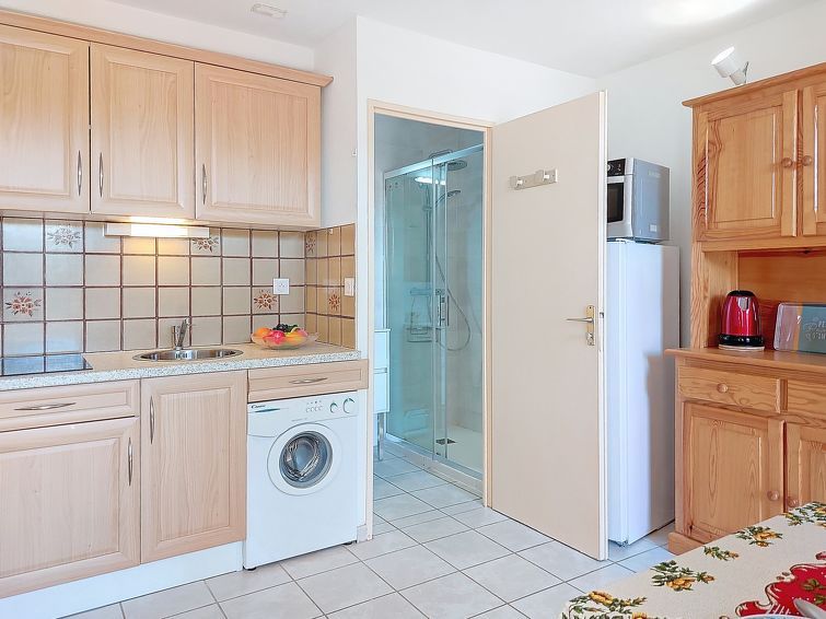 3-room terraced house 40 m2 on 2 levels, on the ground floor, west facing position. Living/dining room with TV (flat screen). Exit to the terrace. Kitchen-/living room (2 ceramic glass hob hotplates, toaster, kettle, electric coffee machine, combination microwave). Shower/WC. Upper floor: 1 room with 1 french bed (1 x 140 cm, length 190 cm), air conditioning.