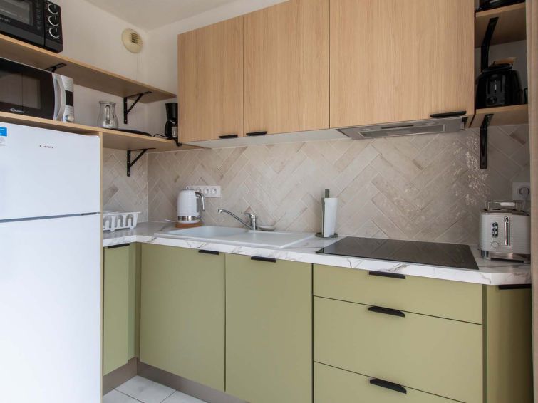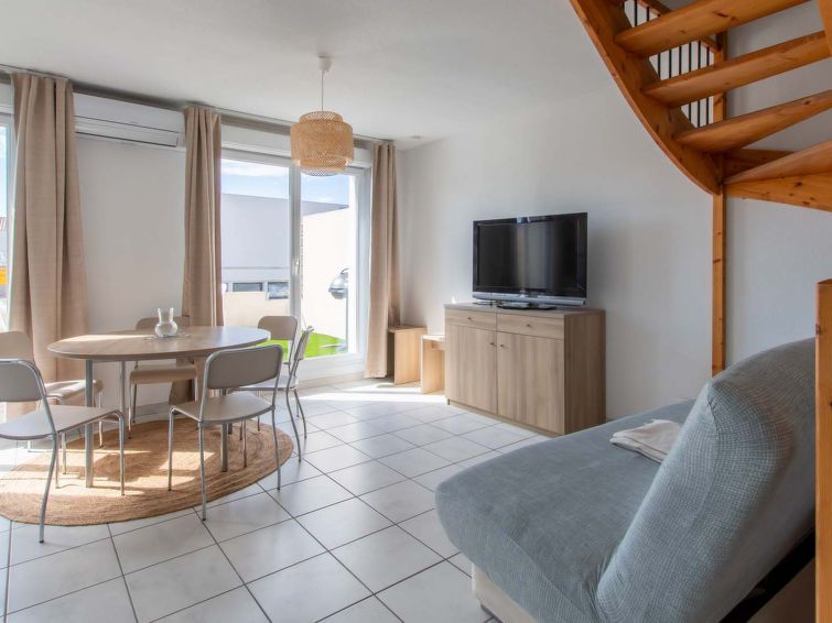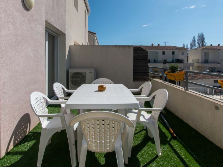 "Cap Camargue F", 3-room apartment 50 m2 on 2nd floor. Object suitable for 7 adults. 1 room with 1 double bed and TV. 1 room with 3 beds. Living room with 1 sofabed and 1 pull-out bed. Open kitchen (4 hot plates, oven, toaster, kettle, microwave, freezer, electric coffee machine).