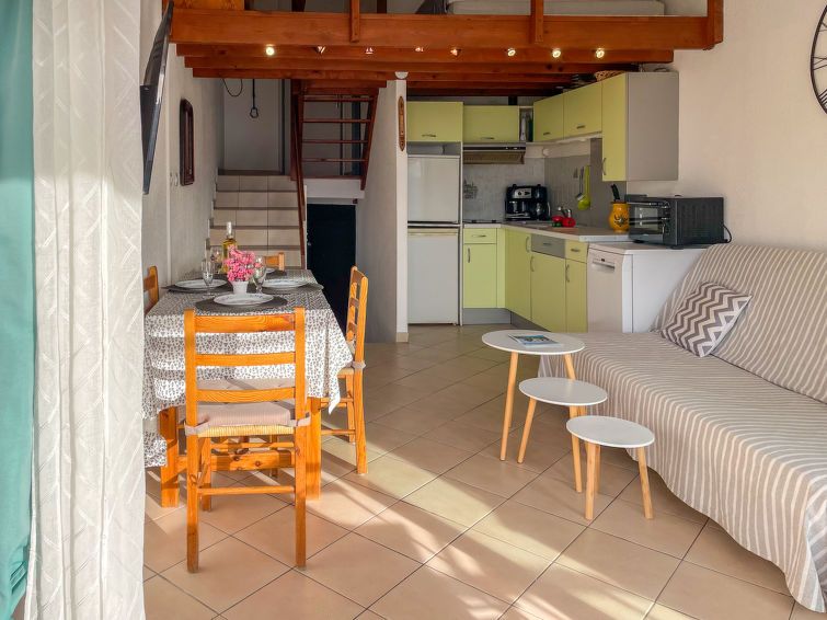 2-room apartment 45 m2 on 2 levels on 3rd floor. Living/dining room with TV and flat screen. Kitchenette (mini-oven, oven, 2 ceramic glass hob hotplates, microwave, electric coffee machine). Upper floor: 1 room with 1 french bed (140 cm, length 190 cm), TV and DVD. Gallery with 1 french bed (140 cm, length 190 cm).
