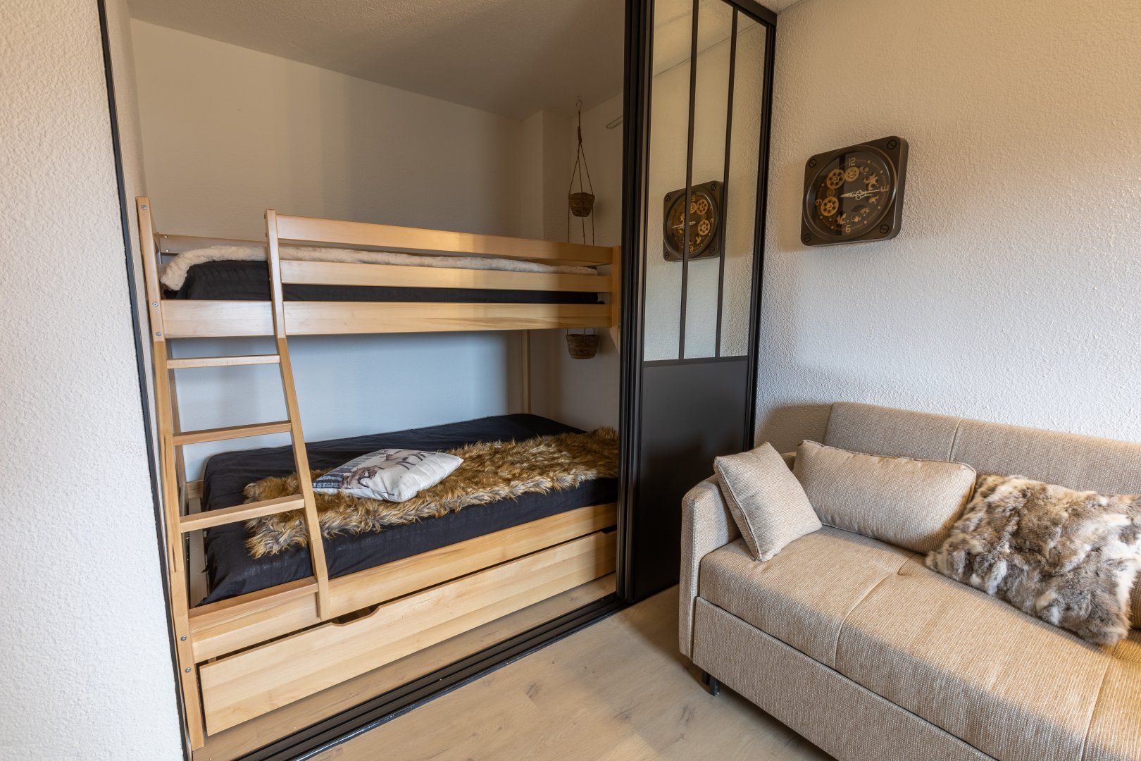 *At full occupancy, one guest will be sleeping on the sofa bed in the living area, and two on the bunk beds accessible via a sliding door from the living area