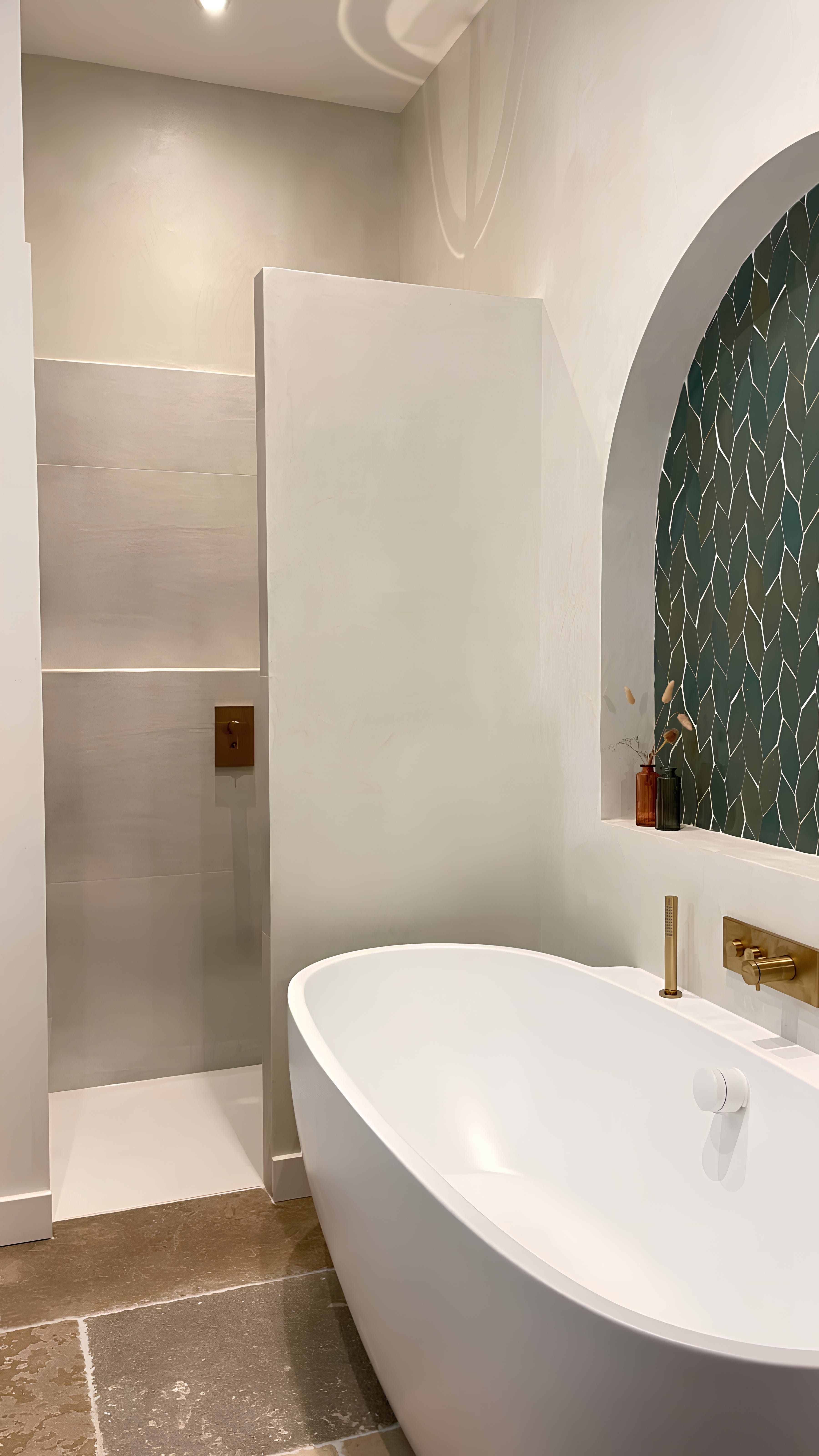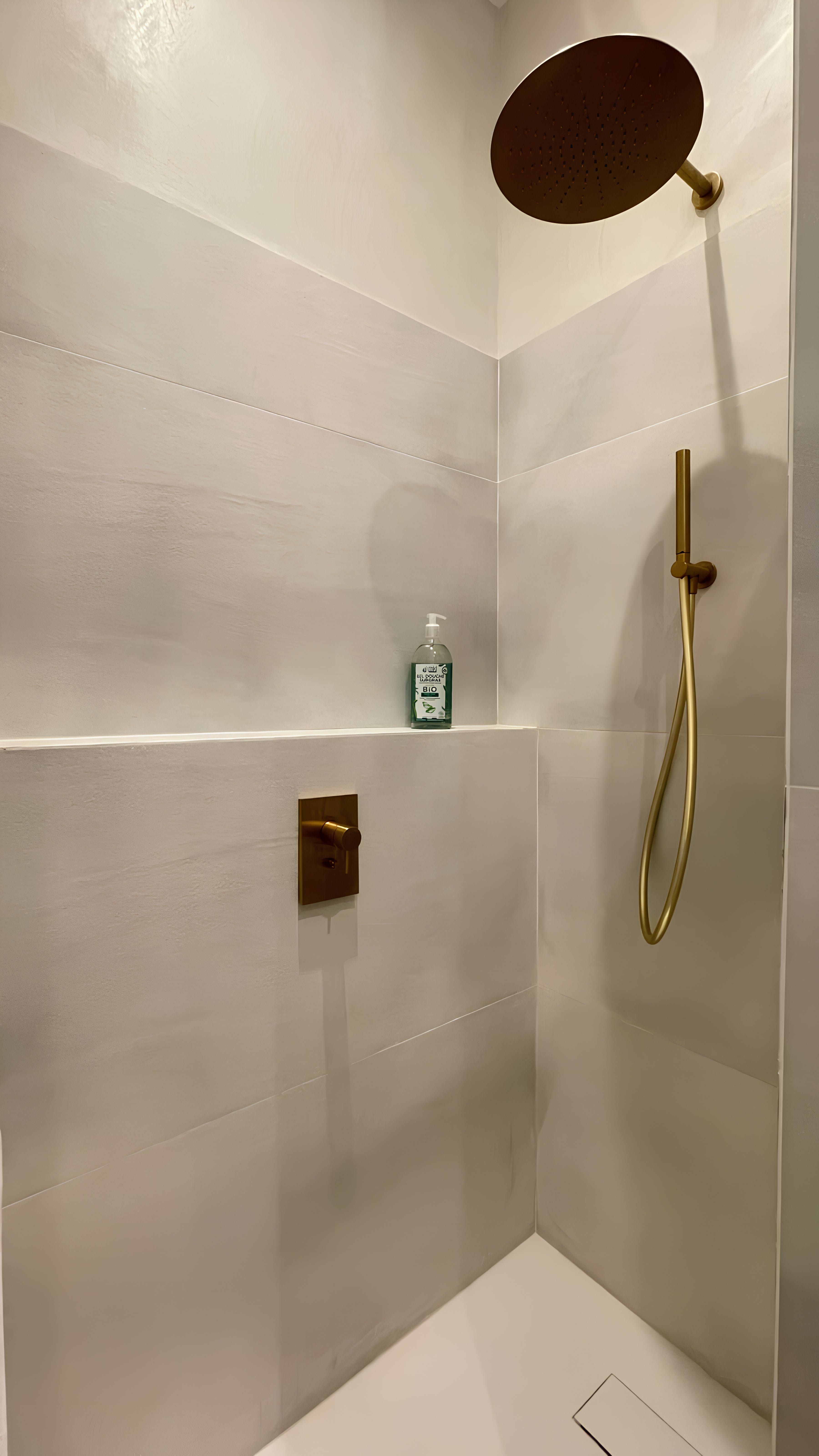 *The bathroom – with a bath and shower – connects to the bedroom with a glass door, so it’s not entirely private. There’s a separate WC though.
