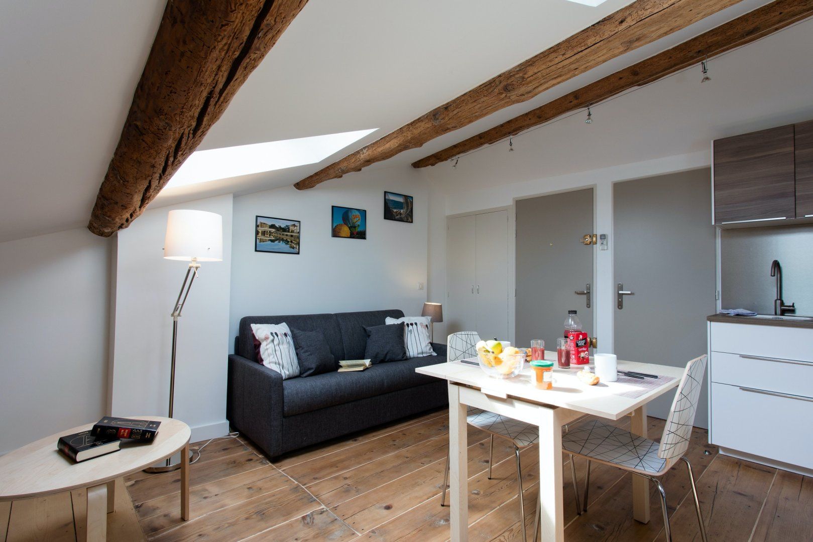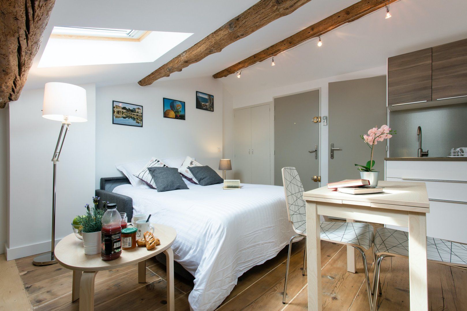Wake up each morning in your comfy sofa bed and cook up some scrambled eggs with boudin noir in your kitchenette. Tuck in together at your cute dining setup, while you discuss together your itinerary for the day. Venture out to explore cobblestone streets and ancient buildings. Upon your return, get the PJs on and grab a book from the mini library for a bit of quiet time on the sofa, or cuddle up together with a movie and a glass of French red wine.