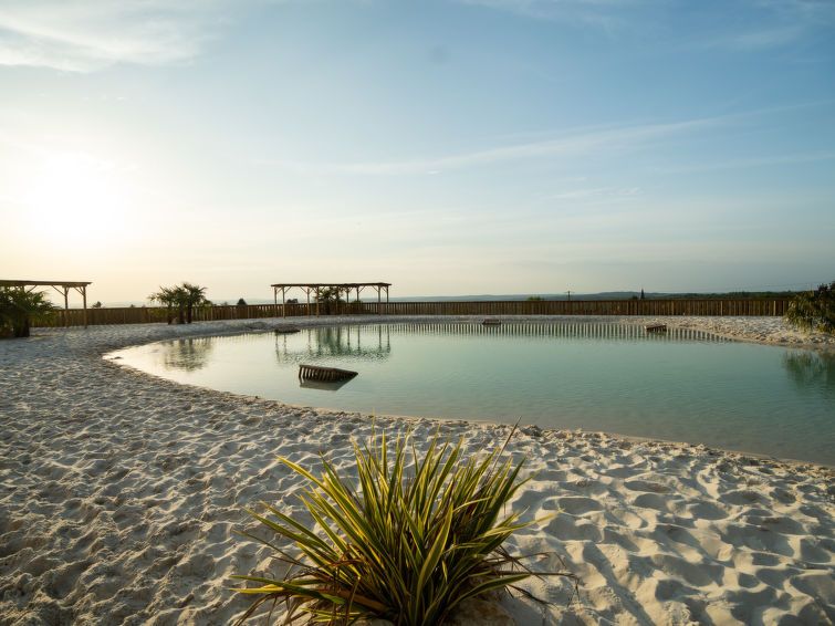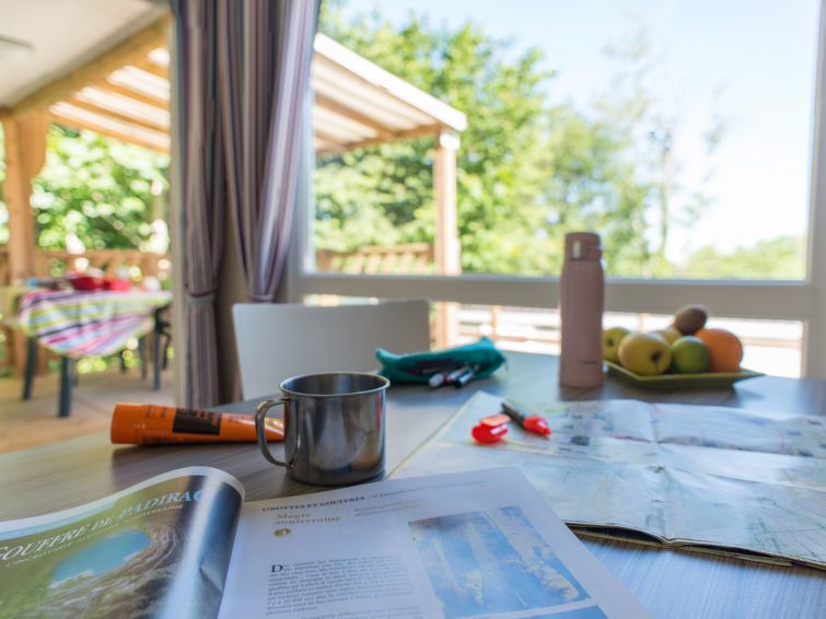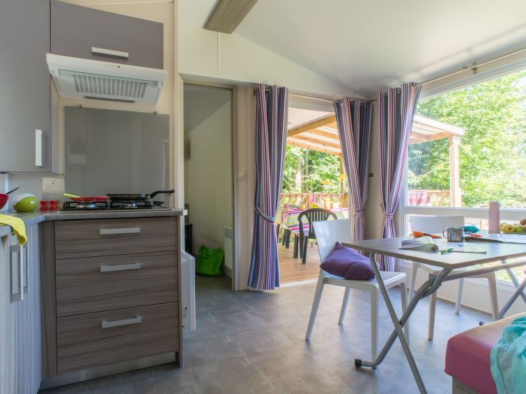 "Prestige 2 chambres 4 personnes", 3-room bungalow 32 m2. Practical furnishings: living/dining room with TV (flat screen), air conditioning. Exit to the terrace. 1 room with 1 french bed (1 x 140 cm, length 190 cm). 1 room with 2 beds (70 cm, length 190 cm). Kitchenette (4 gas rings, toaster, microwave, freezer, electric coffee machine).
