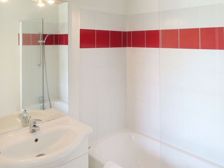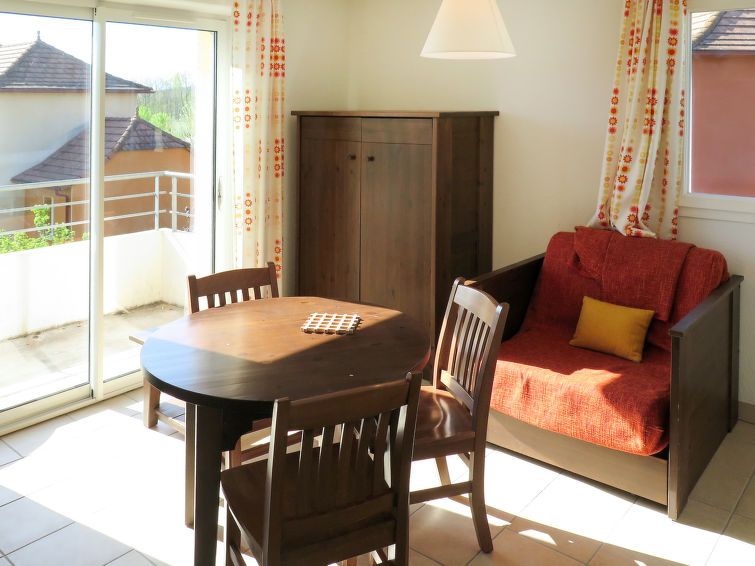 "Le Domaine de Claire Rive", 1-room apartment 25 to 28 m2. Object suitable for 2 adults + 1 child. Practical furnishings: living/dining room with 1 pull-out bed (2 x 80 cm, length 190 cm), 1 sleeping facility (80 cm, length 190 cm), dining table and TV (flat screen). Exit to the balcony, to the terrace.