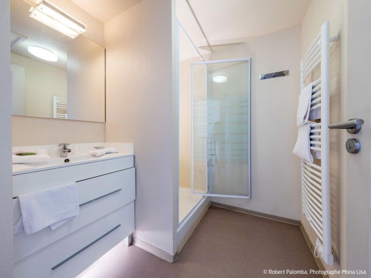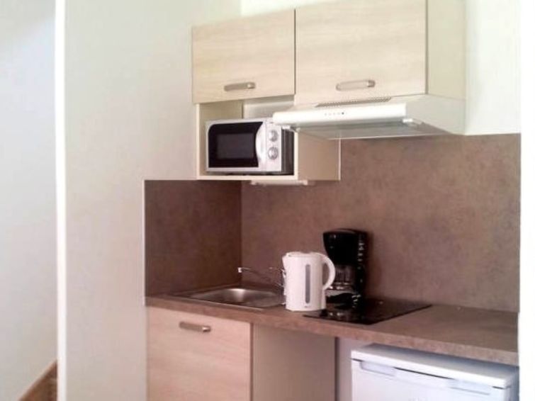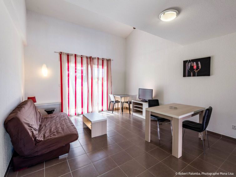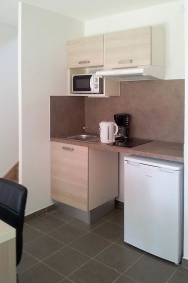 "Domaine de Bacchus-Séjour+Galerie 4 pers", 2-room terraced house 44 m2 on 2 levels. Bright, practical and modern furnishings: living/sleeping room with 1 double sofabed (140 cm, length 190 cm), dining table and TV. Exit to the terrace. Kitchenette (2 ceramic glass hob hotplates, toaster, kettle, microwave, electric coffee machine).