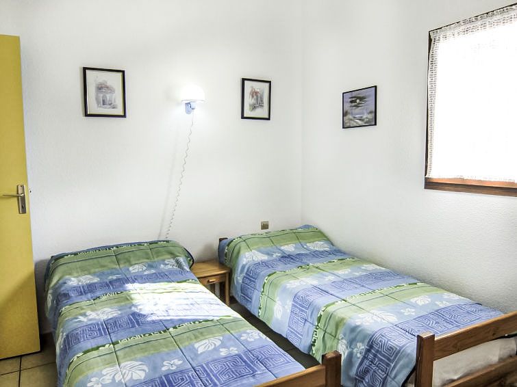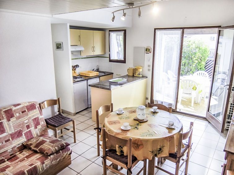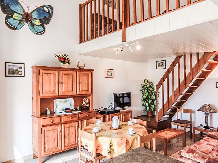 3-room terraced house 58 m2 on 2 levels. Living/dining room with TV and air conditioning. 1 room with 1 french bed. Kitchenette (oven, dishwasher, 2 ceramic glass hob hotplates, electric coffee machine). Bathroom, sep. WC. Upper floor: gallery with 1 double sofabed. 1 room with 2 beds and shower/WC.