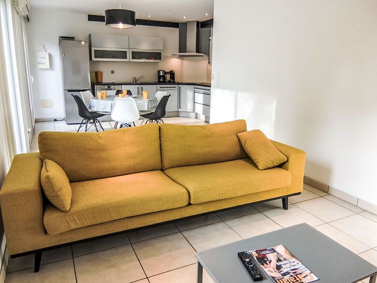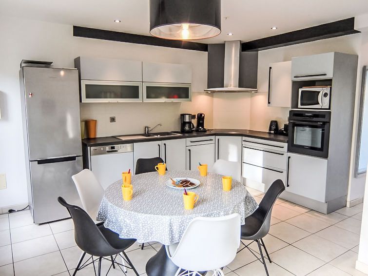 5-room terraced house 120 m2 on 2 levels. Comfortable furnishings: living/dining room with TV and air conditioning. Exit to the garden, to the terrace. Open kitchen (oven, dishwasher, 3 induction hot plates, microwave, freezer). Shower/WC. Heating, air-conditioning. Upper floor: playroom.