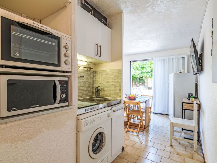 2-room apartment 33 m2, on the ground floor. Renovated in 2024, beautiful furnishings: living/dining room with TV (flat screen). Exit to the terrace. 1 room with 1 double sofabed (140 cm). Sleeping alcove with 1 french bed (140 cm). Kitchenette (oven, 2 induction hot plates, microwave, electric coffee machine, Capsules for coffee machine (DOLCE GUSTO) extra).
