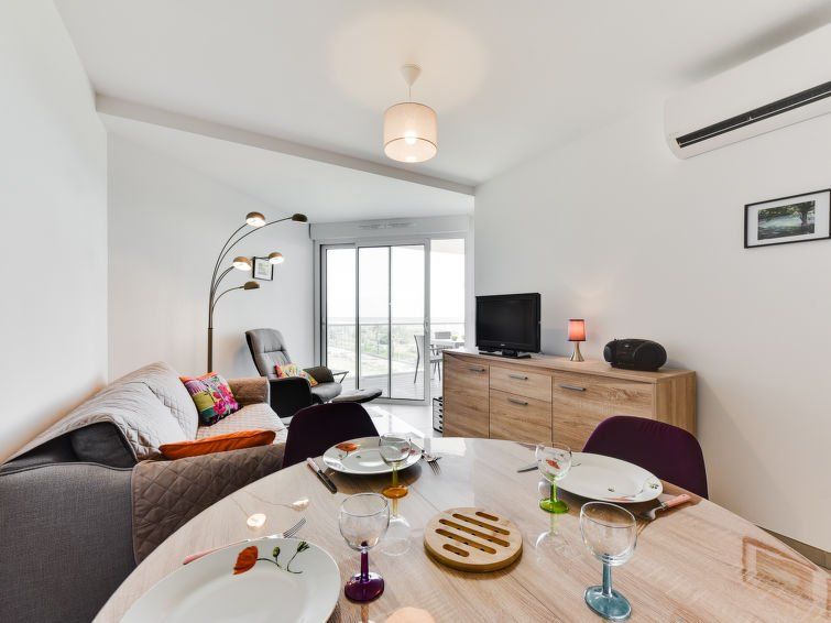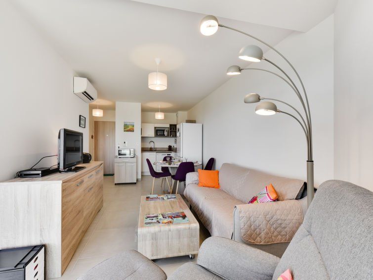 2-room apartment 37 m2 on 3rd floor. Very practical furnishings: living/dining room with 1 double sofabed (140 cm, length 190 cm), TV (flat screen), radio, CD-player and air conditioning. Exit to the terrace. 1 room with 1 double bed (140 cm, length 190 cm). Exit to the terrace. Kitchenette (mini-oven, dishwasher, 4 induction hot plates, microwave, freezer, electric coffee machine, Capsules for coffee machine (Nespresso) extra).