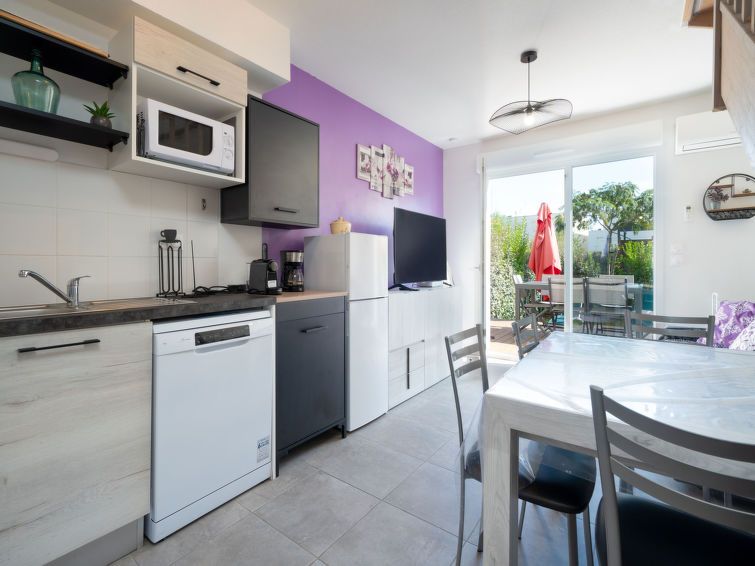 "La Dune", 3-room villa 55 m2, on the ground floor. Object suitable for 6 adults. 1 room with 1 double bed and TV. 1 room with 1 x 2 bunk beds. Living room with 1 sofabed and 1 pull-out bed. Open kitchen (4 hot plates, dishwasher, toaster, microwave, electric coffee machine). Shower/WC.