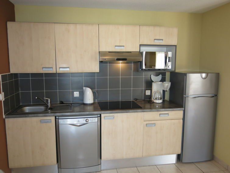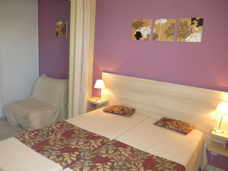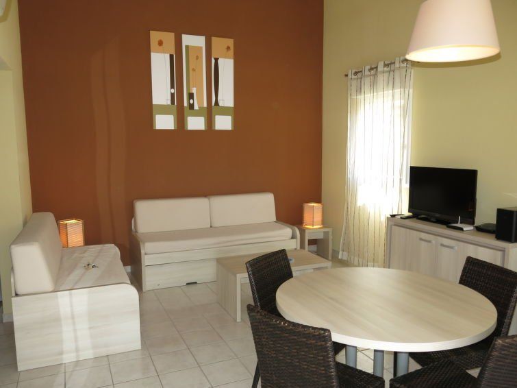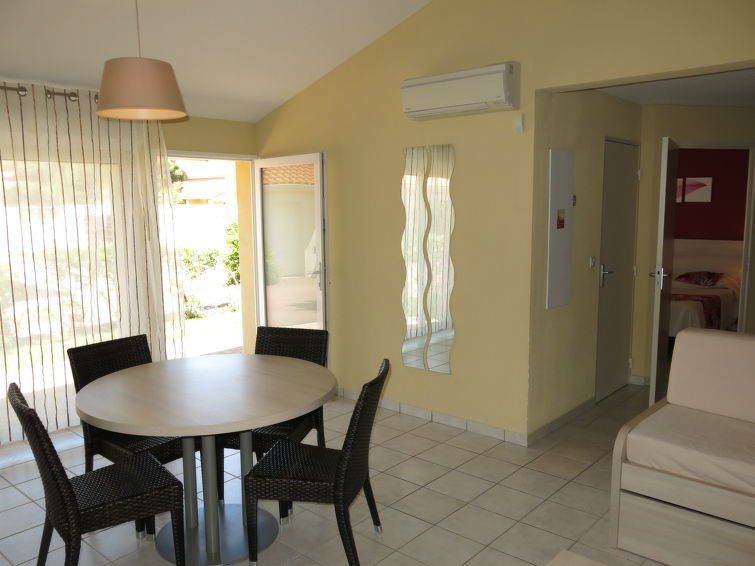 "Le Mas de Torreilles M68X", 3-room terraced house 72 m2 on 2 levels. Object suitable for 6 adults + 2 children. Beautiful and modern furnishings: living/sleeping room with 1 sofabed (80 cm, length 140 cm), 2 pull-out beds (1 pers.), dining table, TV and air conditioning. Exit to the terrace.