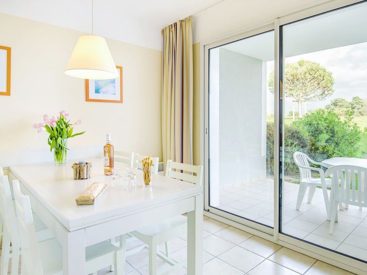 "L'Estran (S4)", 2-room apartment 30 m2, on the ground floor. Practical and beautiful furnishings: living/sleeping room with 1 sofabed (80 cm), 1 pull-out bed, dining table and TV. 1 open small room with 1 x 2 bunk beds. Kitchenette (dishwasher, 2 ceramic glass hob hotplates, microwave).