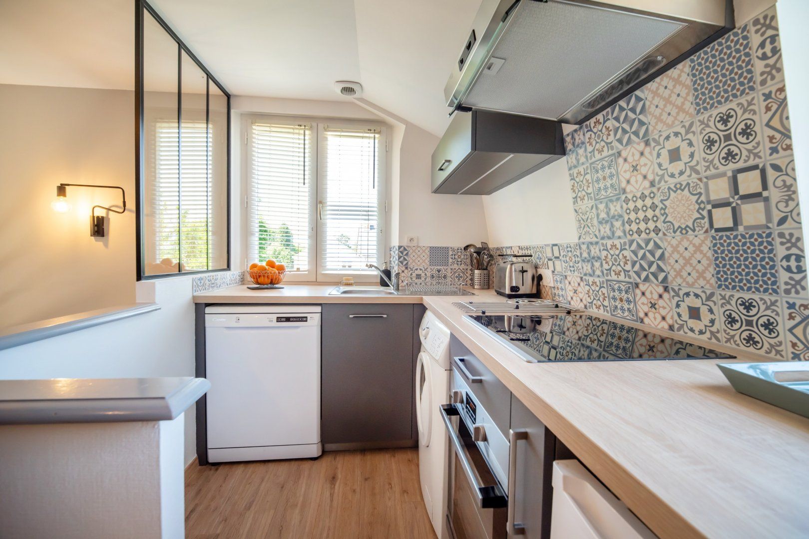 There's something equally charming about the home's interior, with a range of design influences on display, from rustic wooden ceiling beams and the period fireplace to bursts of bold floral wallpaper and mid-century-inspired furnishings. Given the small guest count, the kitchen is perhaps more generously sized than you might have anticipated and finished off with pretty tiles, too.