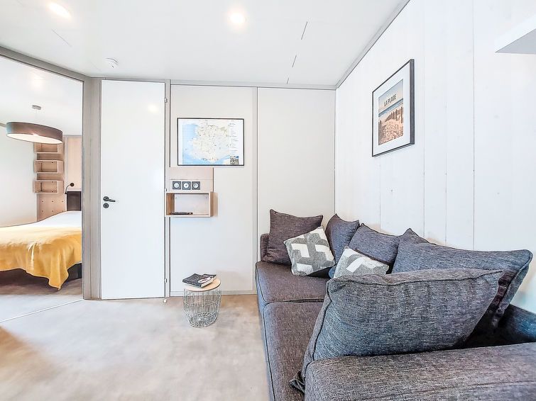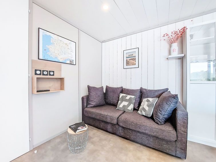 "Chalet moderne La Baule-Guérande", 3-room chalet 48 m2. Very beautiful furnishings: living room with panoramic window with dining nook and TV (flat screen). Exit to the terrace. 1 room with 1 french bed (160 cm, length 200 cm). 1 room with 2 beds (80 cm, length 200 cm), 1 bunk beds (80 cm, length 200 cm) (1 pers.
