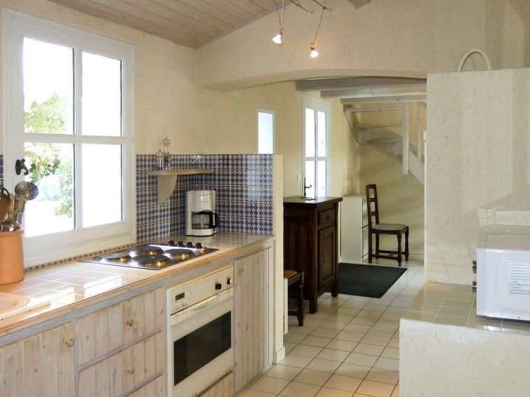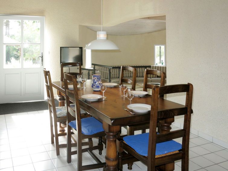 "Les Brisans", 5-room house 100 m2. Beautiful furnishings: living/dining room, on 2 levels with open-hearth fireplace (only for decoration), dining table and TV. Exit to the terrace. 1 room with 1 french bed (1 x 160 cm, length 200 cm). 1 room with 2 beds (90 cm, length 190 cm). Exit to the terrace.