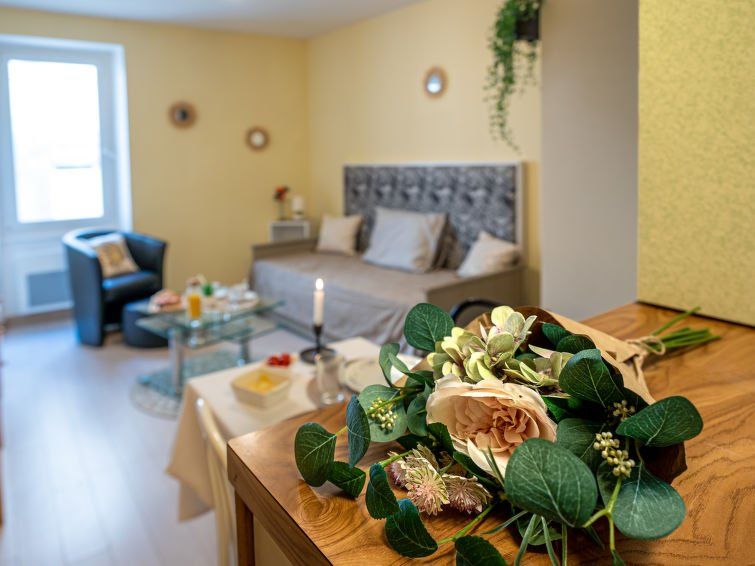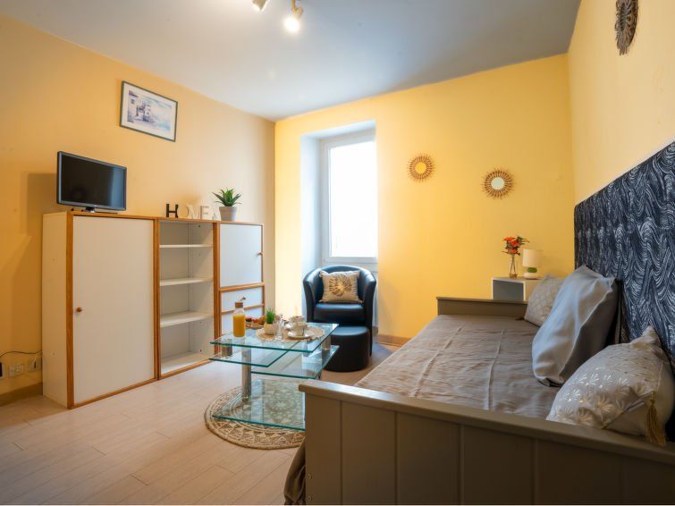 "Studio des Halles", 1-room studio 20 m2 on 1st floor. Comfortable furnishings: Studio with 1 pull-out bed (2 x 80 cm, length 190 cm), TV (flat screen). Small kitchenette (2 ceramic glass hob hotplates, toaster, kettle, electric coffee machine, combination microwave). Shower/WC. Electric heating.