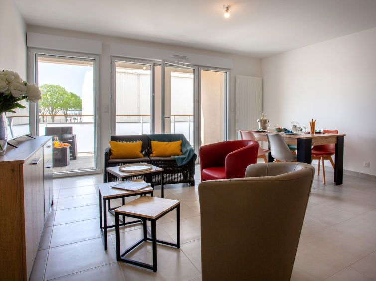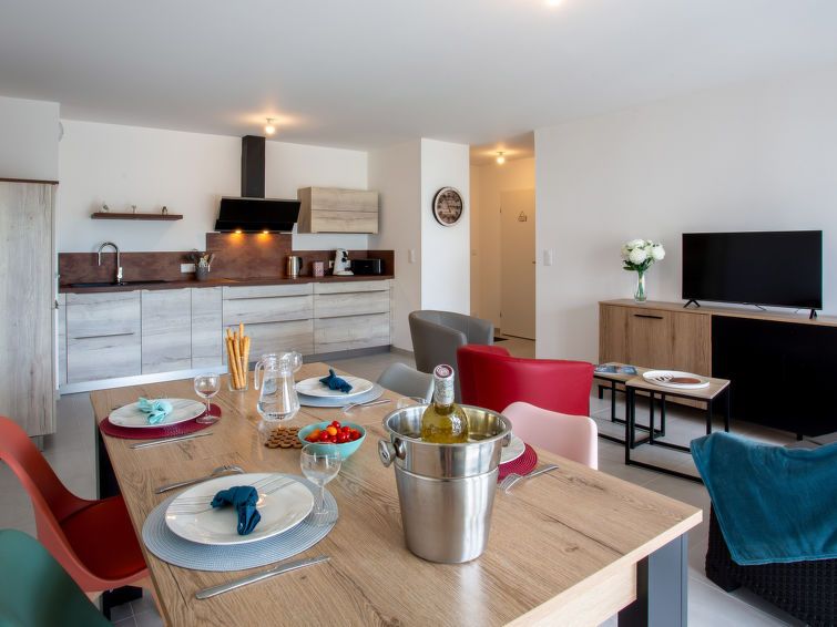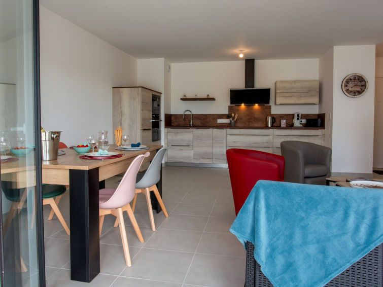 Well-equipped holiday apartment on the first floor of a complex with several apartment buildings. View of the sports field. Quiet location, Pornic harbor is a 10-minute walk away, as are all the shops. The beach is about 30 minutes away. Well suited for adults and families with teenagers. A little more cutlery would have been nice. We found it very annoying that there is only one Senseo coffee maker. A teapot was unfortunately completely missing.
