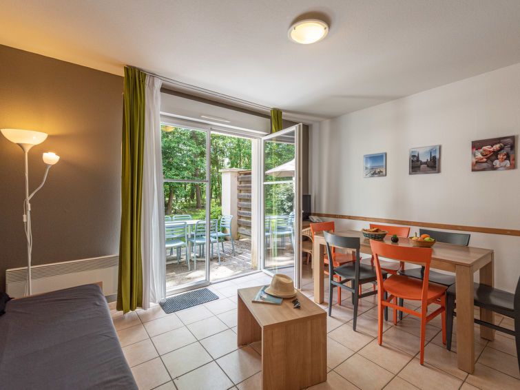 "Cottage Privilège", 3-room terraced house 49 m2 on 2 levels. Practical and beautiful furnishings: living/dining room with 1 pull-out bed (2 pers. 2 x 80 cm, length 190 cm), dining table and TV. Exit to the terrace. Kitchenette (dishwasher, 4 ceramic glass hob hotplates, toaster, kettle, microwave, freezer, electric coffee machine).