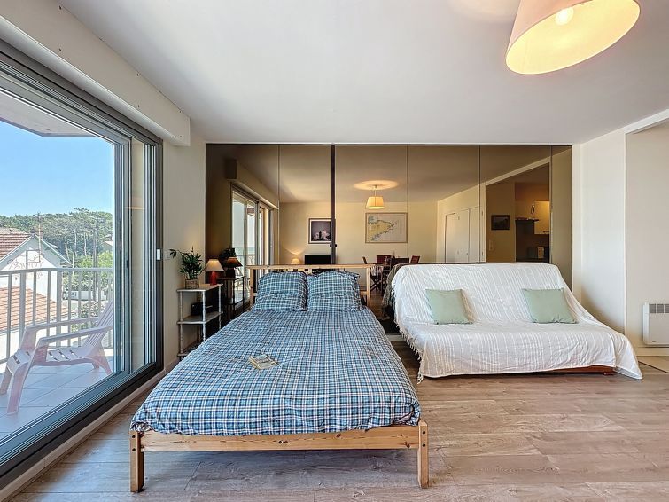 1-room studio 30 m2 on 2nd floor. Beautiful furnishings: living/sleeping room with 1 french bed (140 cm, length 190 cm), TV (flat screen). Exit to the balcony. Open kitchen (oven, 4 ceramic glass hob hotplates, toaster, kettle, microwave, electric coffee machine). Shower/WC. Electric heating.