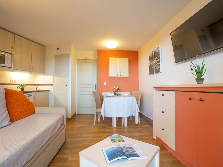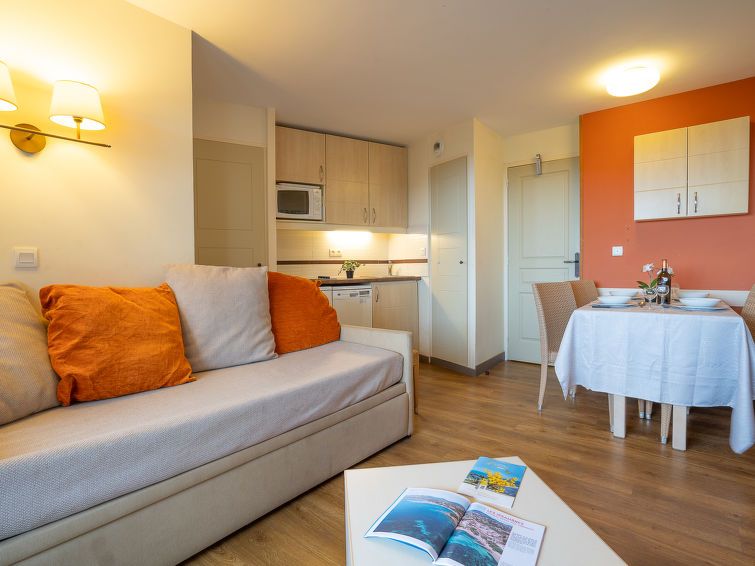 "Le Belvédère (D4 257)", 2-room apartment 27 m2 on 1st floor. Living room with 1 pull-out bed (2 x 80 cm, length 190 cm), TV (flat screen), electric heating and air conditioning. Exit to the terrace. 1 room with 1 french bed (140 cm, length 190 cm), TV (flat screen). Exit to the terrace.