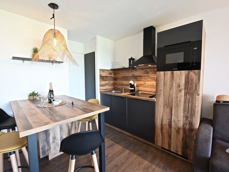 "L'Esquinade (G1 203)", 2-room apartment 28 m2 on 2nd floor, south facing position. Bright, fully renovated in 2024, very comfortable and modern furnishings: living room with 1 sofabed (140 cm, length 190 cm), TV (flat screen). Exit to the terrace. 1 room with 1 french bed (140 cm, length 190 cm).