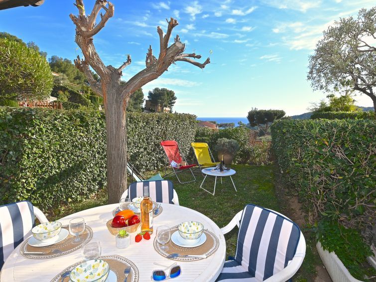 "Cap Estérel - Le Hameau (Mini Villa 12)", 3-room terraced house 56 m2 on 2 levels, south-east facing position. Bright, comfortable and beautiful furnishings: living/dining room with 1 sofabed (140 cm, length 190 cm), TV (flat screen), air conditioning. Exit to the terrace, to the patio.
